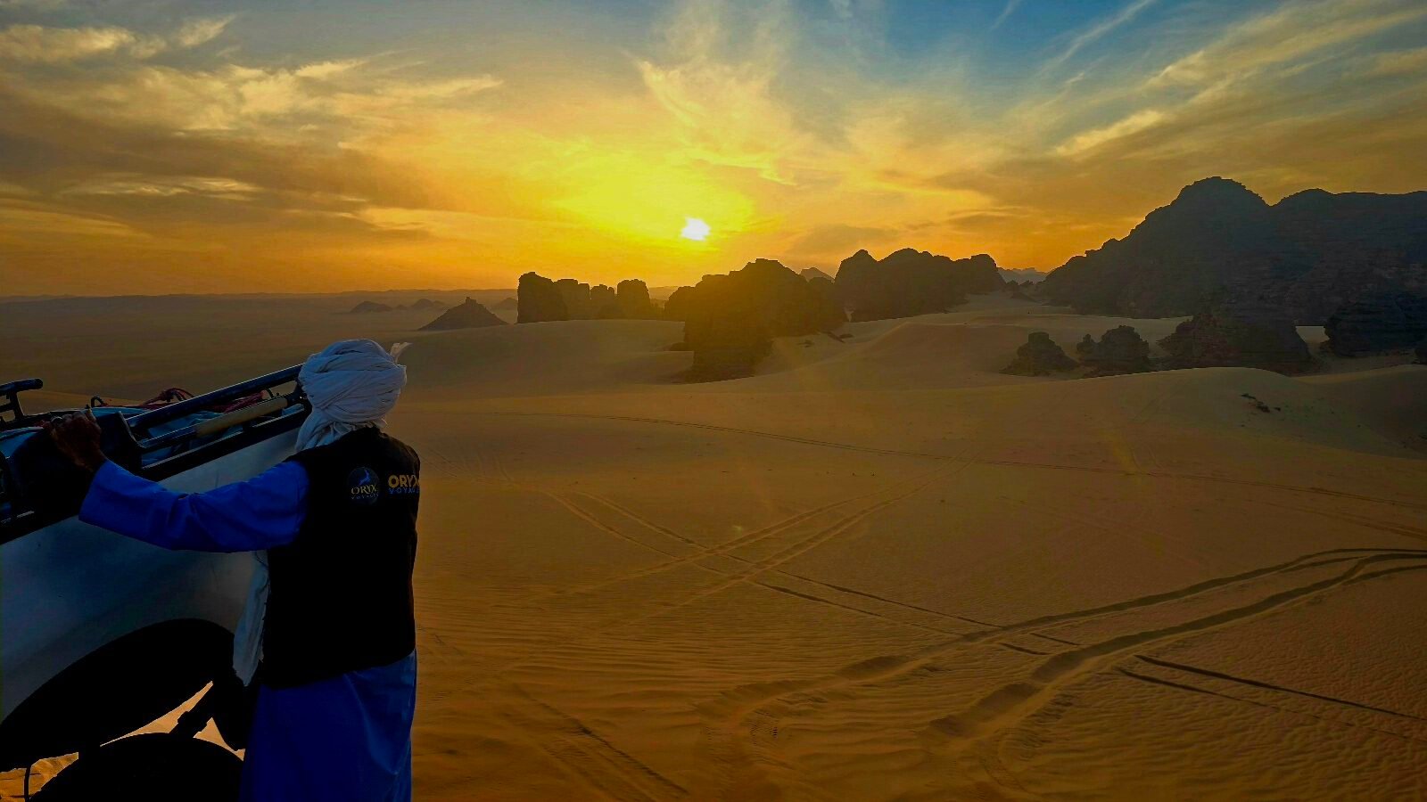 The expedition starts and ends in Djanet, with domestic flights from Algiers to Djanet and back included in the package. All transfers, 4×4 transport, and logistics are handled by Oryx Voyage.